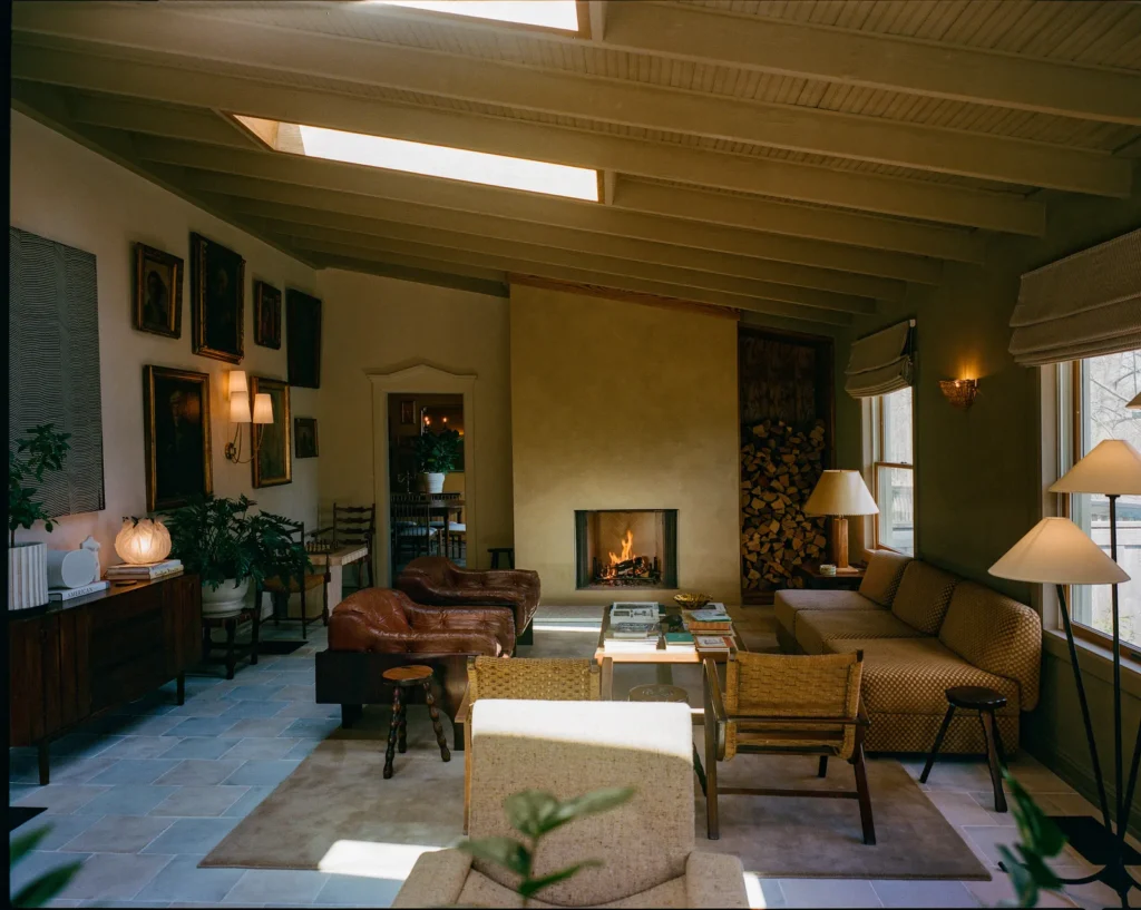 Inside, expect bouclé sofas, curated coffee-table books, and a crackling fireplace that feels like a chic friend’s countryside retreat. The vibe is part mountain hideaway, part minimalist dream, and completely magnetic.