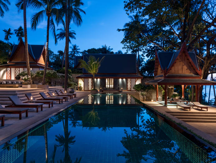 Naka Island is a single structure on Naka Yai Island in Phang Nga Bay, reached by speedboat from Ao Por Pier. The 90 villas are characterized by thatched roofs, curved and natural materials, and bathrooms with access to a garden via stepping-stones. Its initial design was by Habita Architects, but it was renovated by Begray Architects, featuring new luxurious rooms, a refurbished gym, and a beachfront restaurant. The Royal Horizon villa complex has 4 bedrooms, large decks, and a personal pool perfect for a family or wedding.
